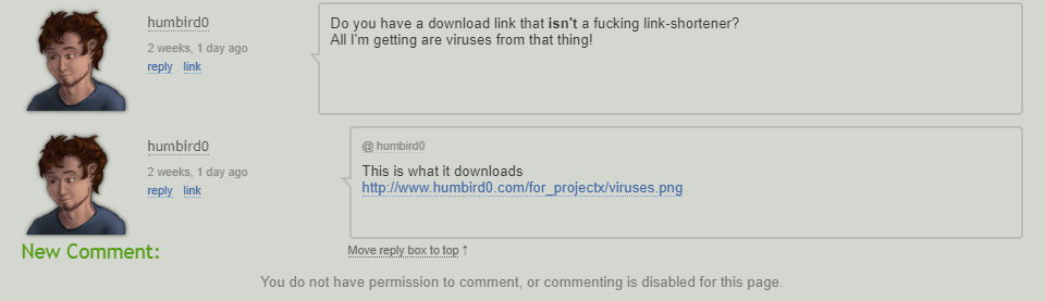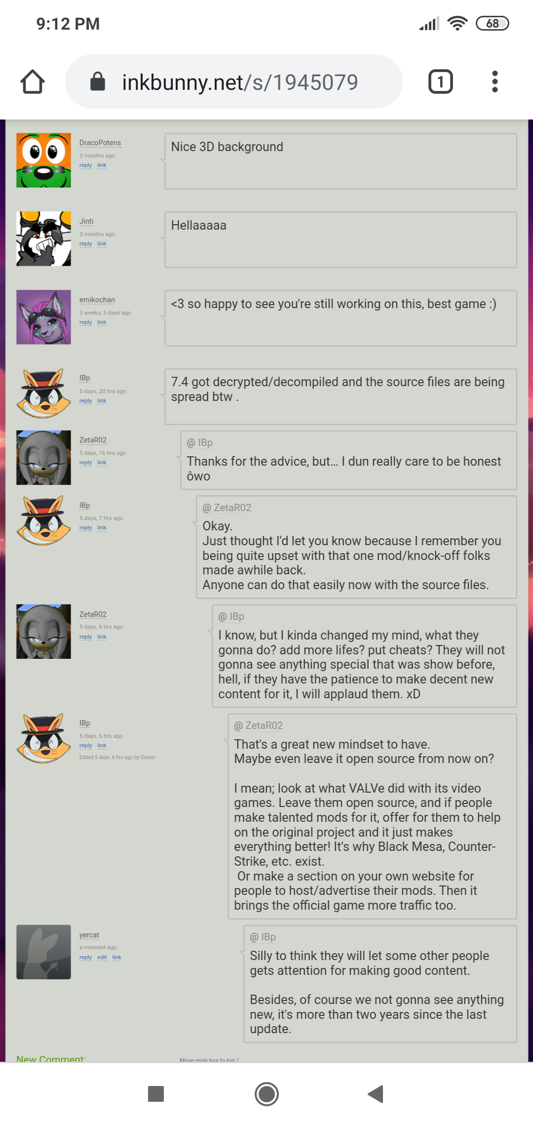 The comic with Moralde was a offer he propose me to use my character on his comic, it has nothing to do with me, I don't run the comic, I don't draw for it, have any problem? are you jealous? fuck you if you are, I'm happy. My accounts are hidden, because I want to rest from shit people like you, I don't want to be a public person for now, and it made me think, why I have to work for assholes like you? When I was a person who always be after the money? NEVER, I barely did commissions or stuff to win it, I never beg for it explaining I had a trouble of anything, as I said before, I have a job, I don't need extra money for a living, I never manipulate anyone or be a coward like you are hidding in a forum where you're safe, if you have the balls contact with me directly and let's talk in private, I really would like that, if not, you're just a pathetic entity. Your words are simple farts in the middle of the desert that can't convice anyone than just the people who are here and don't know anything, but I can't expect much more from a stupid who never did anything for any community than just throw shit from his mouth. For those, who wants to edit and hack the game, I'm gonna tell something, I don't care if you edit or hack it, just keep it for YOURSELF, if I get angry seeing the people is editing it, is because the game IS IN DEVELOPMENT, let me finish the damn game, then edit anything you want, I don't care! but give me time to finish it first. If ANY of you can sprite or mod, they are welcome to contact with us, becase WE need help to advance it.