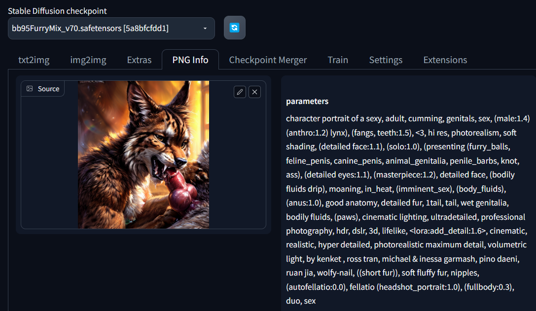 Steps: 80, Sampler: DPM++ 2M Karras, CFG scale: 7, Seed: 1954505552, Face restoration: GFPGAN, Size: 512x512, Model hash: e7056f7a24, Model: bb95FurryMix_v60, Denoising strength: 0.7, Hires resize: 768x768, Hires upscaler: Latent (nearest)