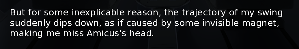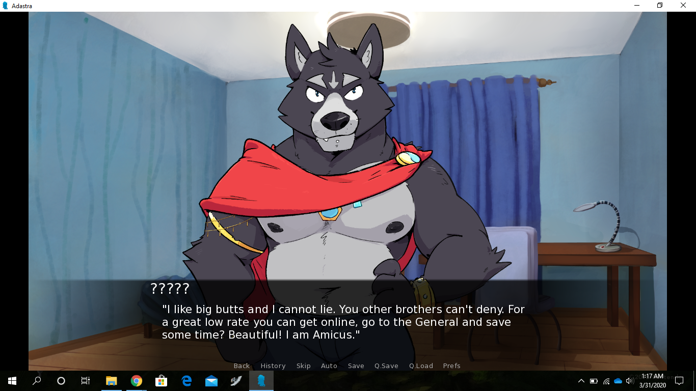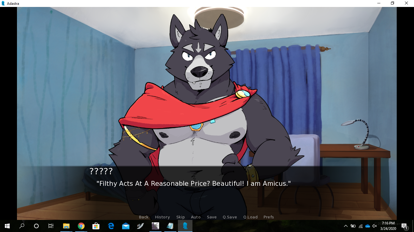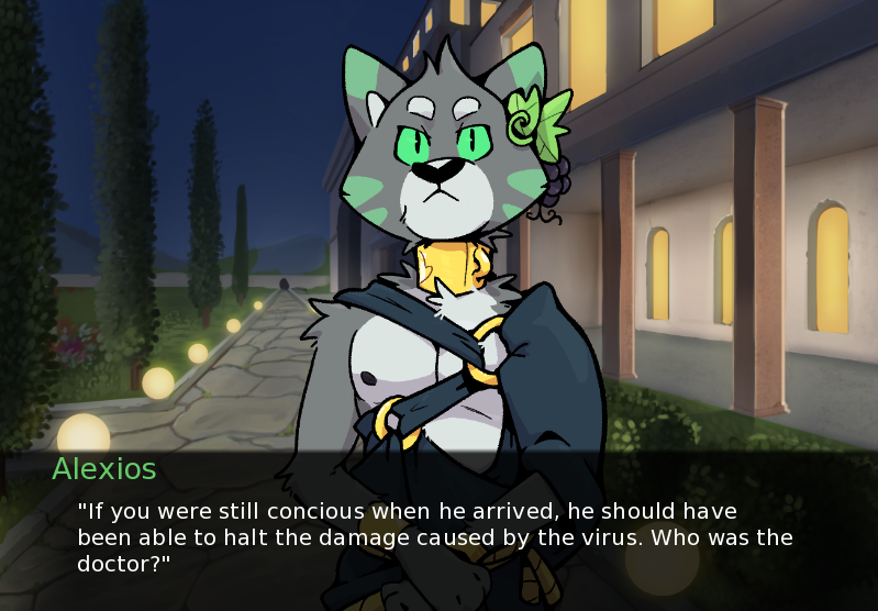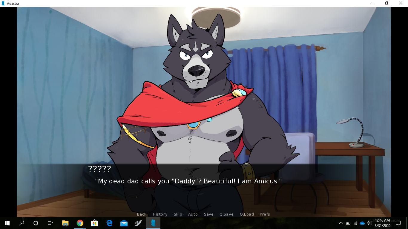 This brings me to another topic that has been brought up quite a bit since the start of this VN: decisions. They're a hallmark of visual novels, and as you might have been able to tell with my work, including with Echo, I don't utilize them very often, mostly because I dislike meaningless decisions that don't affect the story much. I prefer going along for the ride, and only making choices when they matter (instead of stressing over ones that actually don't). Adastra, specifically the character Amicus, has a very linear story, and aside from the ending, it won't branch off much. If, however, you guys enjoy flavor text (with decisions that don't have a huge impact), I will take that into consideration in the future, maybe even do a poll on that.