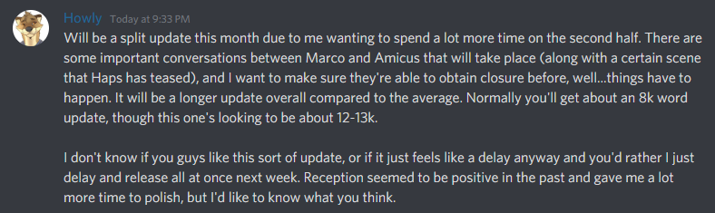 Hey guys! So after getting a lot of feedback on the patron build, I went back in and re-worked some stuff toward the end. There's a lot of intense emotions in this update, so it's understandable that things got a bit heated. I agreed with some of the issues people took with the update however, and tried to address some of that. Keep in mind that things are starting to get a bit more serious in the story, so do expect that the tone might be shifting a little (and no, not Echo-levels of tone shift - this is not a horror VN!).